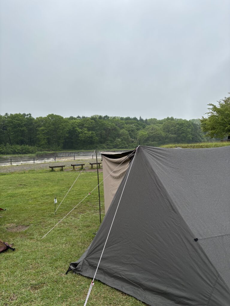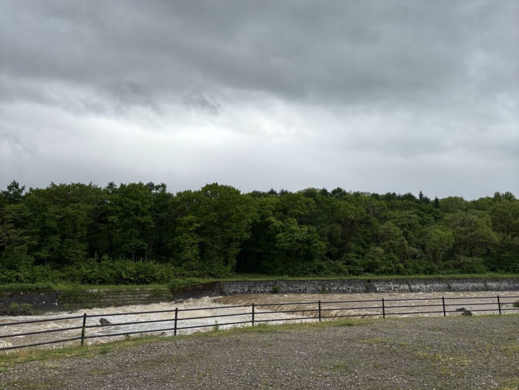 本来ならばこの向きに盛大な岩手山が見えるハズ…今日は水位マシマシの松川の流れも轟音。会話も聞き取りにくい…。さて、気を取り直して今日の宴会幕を作りましょうか。