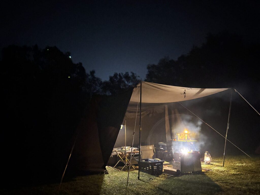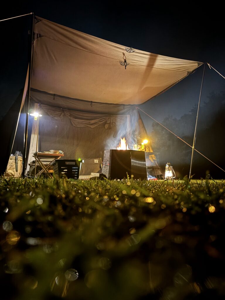 空も暗くなり、フュアハンドランタンに灯をともす。雲の晴れ間からのぞく星。雨降りのシトシトキャンプもまたいい雰囲気ですね。焚き火ってずっと見ていられるんですよね。川の音、ぼーっと焚き火をしてビールを飲む。そしてまた薪を焚べる。今この時だけを楽しむ贅沢な時間。