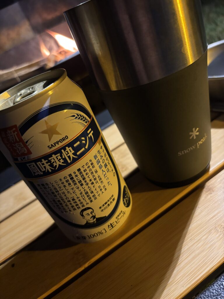 汗だくで設営後は一風呂浴びたい所ですが…まずは🍺でしょう。連勤疲れに長距離運転。頑張った自分にご褒美を。スノーピークさんの【人生に野遊びを】的な。