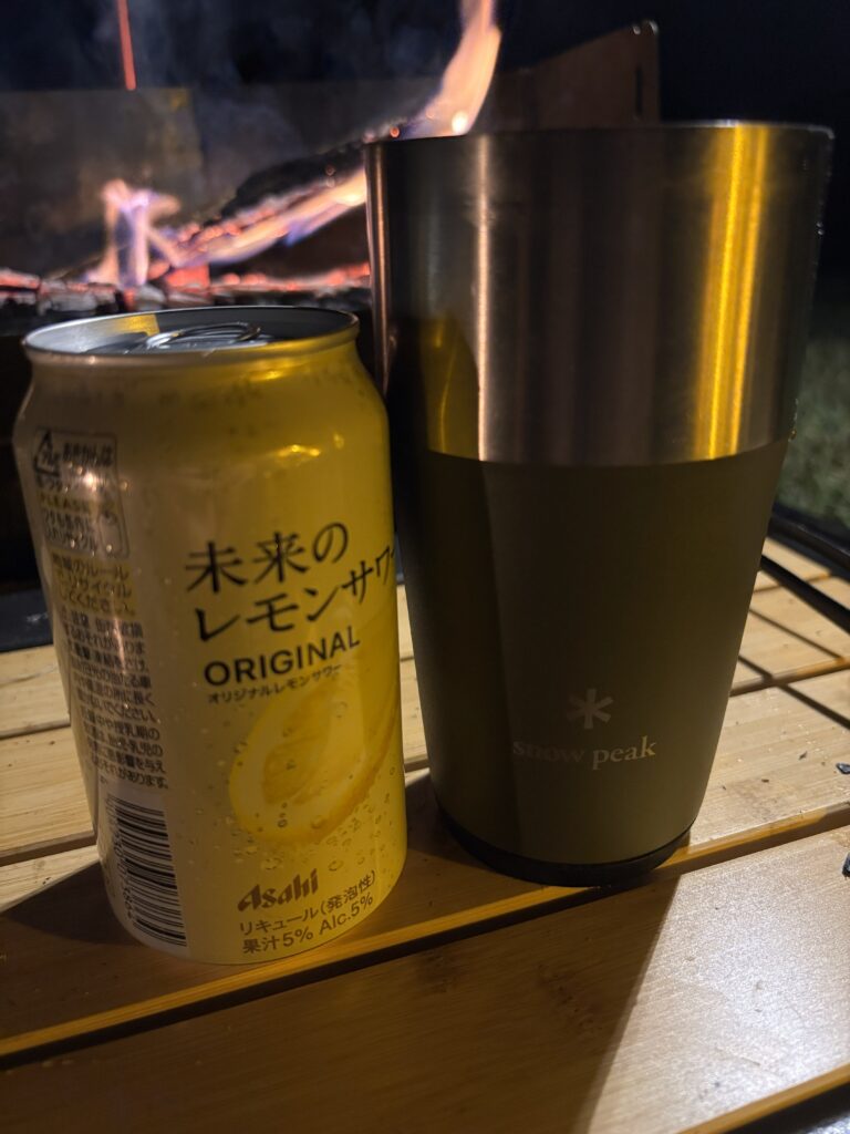 焚き火タイム。焚き火をするためにキャンプをしているようなもの。聖地でお酒を呑みながら焚き火、サイコウの時間。のんびり過ごします。