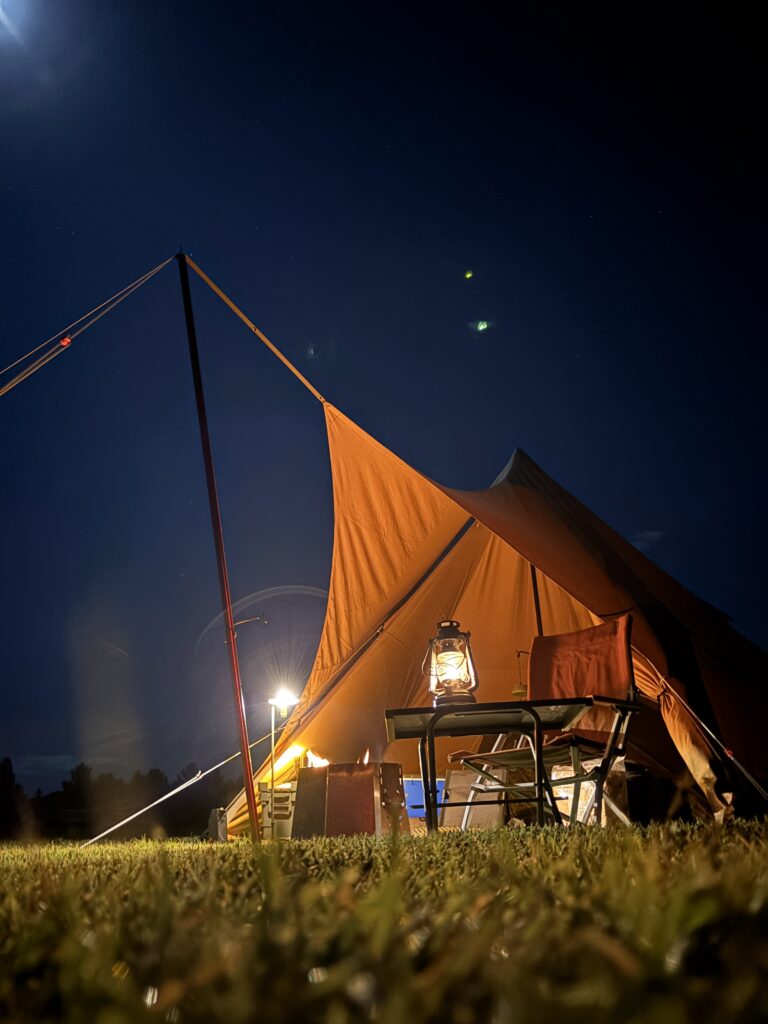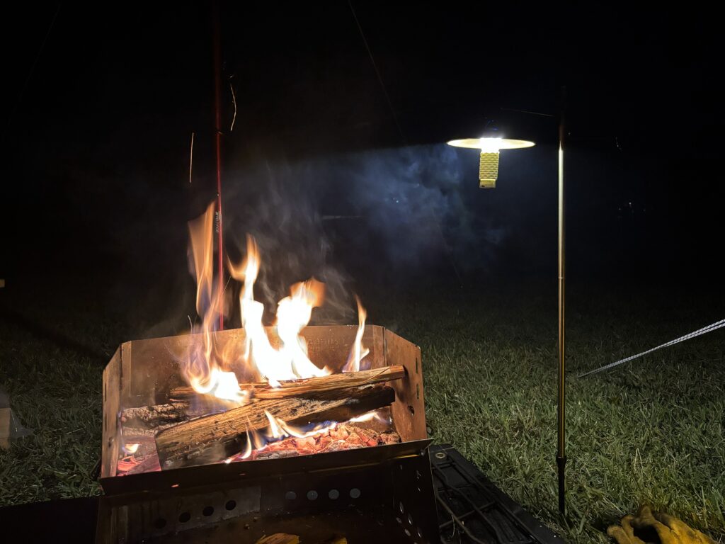 お酒を浴びるくらい飲んで、ipadで映画を見ながら焚き火に薪を焚べる…。この景色を残したくていろんな角度から写真を撮りまくります💦